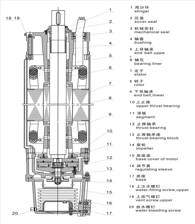 電動機機構(gòu) 1、 潛水電機由定子、轉(zhuǎn)子、上下導(dǎo)軸承、下連接法蘭、底座、軸伸密封裝置等組成。 2、 潛水電機各止口連接處采用密封圈密封;軸伸密封根據(jù)水質(zhì)含砂量多少,選擇不同方式的密封裝置。(含砂量大于0.01%時采用橡膠骨架油封;含砂量大于0.01-0.5%時采用機械密封) 3、 電動機下部裝有橡膠調(diào)節(jié)囊,其作用為當(dāng)電機內(nèi)部熱脹冷縮時及電機外部水位高低變化時,用以平衡電機內(nèi)腔與水的壓力。 4、 電動機定子繞組采用耐水絕緣線,有良好的絕緣能力,繞組線與耐水JHS型電纜連接。 5、 潛水電機上、下導(dǎo)軸承座內(nèi)裝有軸瓦,轉(zhuǎn)子下部裝有止推軸承。止推軸承由上、下止推軸承及滑板組成,用于承擔(dān)軸向力,上止推軸承為塊環(huán)形,下止推軸承為分塊扇形。 技術(shù)支持 1、保證電機的引出電纜處端電壓為380(1±5%)V,頻率為50(1±1%)HZ(其它電壓或頻率須特殊訂貨)。 2、電機的******運行電流不得大于銘牌上的標(biāo)定值(即額定電流,配套廠家和用戶在選用和調(diào)試潛水電泵機組的電源控制設(shè)備時,應(yīng)特別注意); 3、電機應(yīng)選用合適的控制方式(可實現(xiàn)電機的過載、欠壓、斷相運行的保護并可根據(jù)水位自動控制電泵的起停); 4、電機為連續(xù)工作制(S1)。兩次起動時間間隔不得小于10分鐘; 5、電機應(yīng)可豎直使用,也可臥式使用(須特殊訂制); 6、用于水池或超過規(guī)定的井徑中時應(yīng)加裝吸水罩,使電機表面的水流速度達到0.5-1m/s,以保證電機良好的散熱。吸水罩應(yīng)將電動機和第一,二級泵包括在內(nèi)。 供貨范圍 潛水電機主機(包括3米引纜),電纜的接頭絕緣粘帶(包括優(yōu)質(zhì)聚氯乙烯粘帶、自熔乙丙膠帶、丁基橡膠自粘帶)使用維護說明書1份,合格證1份裝箱單1份,木箱包裝 注:當(dāng)環(huán)境水或電網(wǎng)電壓、頻率不符合上述規(guī)定時,用戶可以提出要求,本公司提供訂制適用產(chǎn)品。