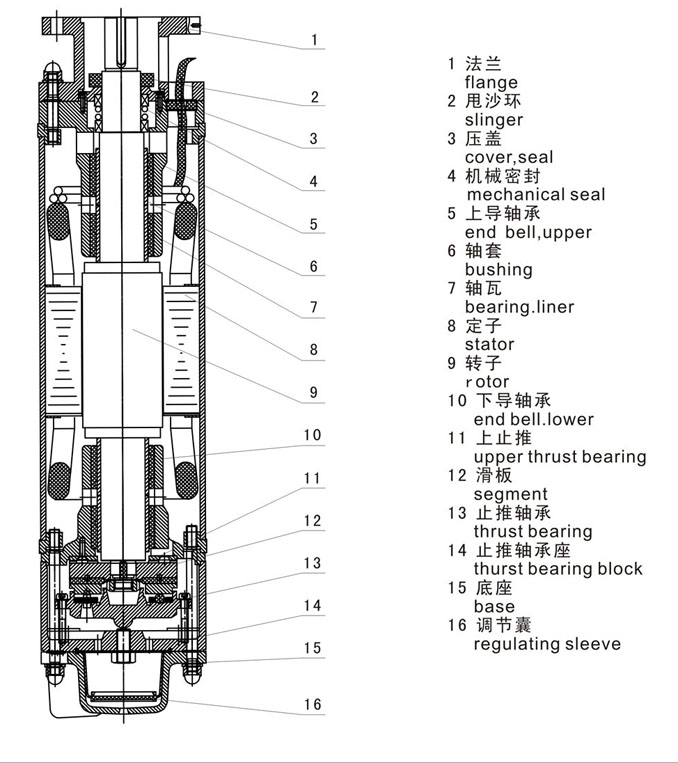 注:高推力型軸承需特殊訂貨,采用高推力型軸承的電機(jī)性能由用戶與制造廠協(xié)議。適用條件 1、電動(dòng)機(jī)應(yīng)完全潛入水中立式(或臥式適用),其潛入深度不大于70m,但不小于20m,最底位置距井底不少于5m(臥式使用時(shí)水位應(yīng)高于潛水電機(jī)1m以上)。 2、介質(zhì)水溫不高于20℃。 3、水中固體雜質(zhì)含量(重量比)不超過0.01%。 4、水中氯離子含量不得超過400mg/L; 5、水中硫化氫含量不得大于1.5mg/L; 6、介質(zhì)水中不含腐蝕性物質(zhì),PH值在6.5-8.5范圍內(nèi)。 7、電機(jī)運(yùn)行時(shí)內(nèi)部應(yīng)充滿潔凈的清水(可加防凍液)。 設(shè)備特點(diǎn) ★ 電機(jī)防護(hù)等級(jí):IPX8,絕緣等級(jí)為F; ★ 充水式潛水電動(dòng)機(jī)結(jié)構(gòu)簡(jiǎn)單,定轉(zhuǎn)子繞組和鐵心直接浸在水中,冷卻效果好、輸出功率大、效率較高。 ★ 由于充水式潛水電動(dòng)機(jī)內(nèi)腔所充多為清水,使用過程中產(chǎn)生的滲漏對(duì)所安裝使用井水水質(zhì)不會(huì)產(chǎn)生污染。 ★ 充水式潛水電動(dòng)機(jī)的定子繞組。鐵心很軸承均在水中工作,對(duì)定子繞組所使用上網(wǎng)導(dǎo)線及其加工工藝、接頭材料及包扎工藝、水潤滑軸承的結(jié)構(gòu)、材料及加工工藝、鐵心與金屬材料的防銹防腐蝕處理等有很高的要求。 電動(dòng)機(jī)結(jié)構(gòu) 1、 潛水電機(jī)由定子、轉(zhuǎn)子、上下導(dǎo)軸承、下連接法蘭、底座、軸伸密封裝置等組成。 2、 潛水電機(jī)各止口連接處采用密封圈密封;軸伸密封根據(jù)水質(zhì)含砂量多少,選擇不同方式的密封裝置。(含砂量大于0.01%時(shí)采用橡膠骨架油封;含砂量大于0.01-0.5%時(shí)采用機(jī)械密封) 3、 電動(dòng)機(jī)下部裝有橡膠調(diào)節(jié)囊,其作用為當(dāng)電機(jī)內(nèi)部熱脹冷縮時(shí)及電機(jī)外部水位高低變化時(shí),用以平衡電機(jī)內(nèi)腔與水的壓力。 4、 電動(dòng)機(jī)定子繞組采用耐水絕緣線,有良好的絕緣能力,繞組線與耐水JHS型電纜連接。 5、 潛水電機(jī)上、下導(dǎo)軸承座內(nèi)裝有軸瓦,轉(zhuǎn)子下部裝有止推軸承。止推軸承由上、下止推軸承及滑板組成,用于承擔(dān)軸向力。 技術(shù)支持 1、保證電機(jī)的引出電纜處端電壓為380(1±5%)V,頻率為50(1±1%)HZ(其它電壓或頻率須特殊訂貨)。 2、電機(jī)的******運(yùn)行電流不得大于銘牌上的標(biāo)定值(即額定電流,配套廠家和用戶在選用和調(diào)試潛水電泵機(jī)組的電源控制設(shè)備時(shí),應(yīng)特別注意); 3、電機(jī)應(yīng)選用合適的控制方式(可實(shí)現(xiàn)電機(jī)的過載、欠壓、斷相運(yùn)行的保護(hù)并可根據(jù)水位自動(dòng)控制電泵的起停); 4、電機(jī)為連續(xù)工作制(S1)。兩次起動(dòng)時(shí)間間隔不得小于10分鐘; 5、電機(jī)應(yīng)可豎直使用,也可臥式使用(須特殊訂制); 6、用于水池或超過規(guī)定的井徑中時(shí)應(yīng)加裝吸水罩,使電機(jī)表面的水流速度達(dá)到0.5-1m/s,以保證電機(jī)良好的散熱。吸水罩應(yīng)將電動(dòng)機(jī)和第一,二級(jí)泵包括在內(nèi)。 供貨范圍 潛水電機(jī)主機(jī)(包括3米引纜),電纜的接頭絕緣粘帶(包括優(yōu)質(zhì)聚氯乙烯粘帶、自熔乙丙膠帶、丁基橡膠自粘帶)使用維護(hù)說明書1份,合格證1份裝箱單1份,木箱包裝。 注:當(dāng)環(huán)境水或電網(wǎng)電壓、頻率不符合上述規(guī)定時(shí),用戶可以提出要求,本公司提供訂制適用產(chǎn)品。